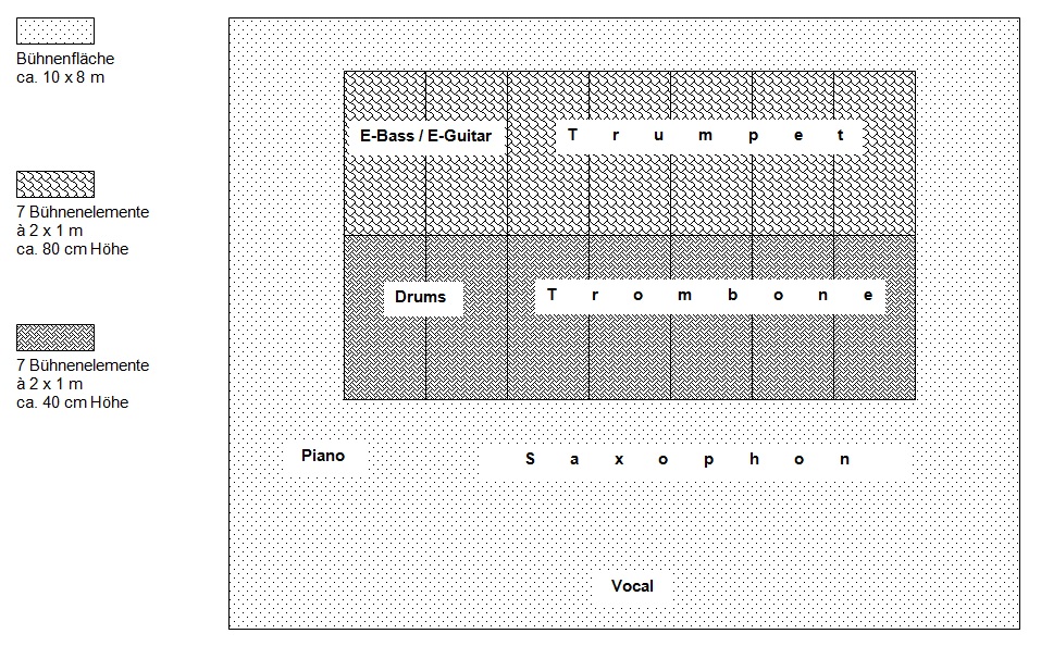 An der Bühne müssen sich je ein eigens abgesicherter 16 A CEEKON und ein 16 A Schuko – Anschluss befinden. Es muss die komplette zulässige Leistung der beiden Anschlüsse der Bigband zur Verfügung stehen. Die Stromanschlüsse müssen weniger als 10 m von der Spielfläche entfernt vorhanden sein.
